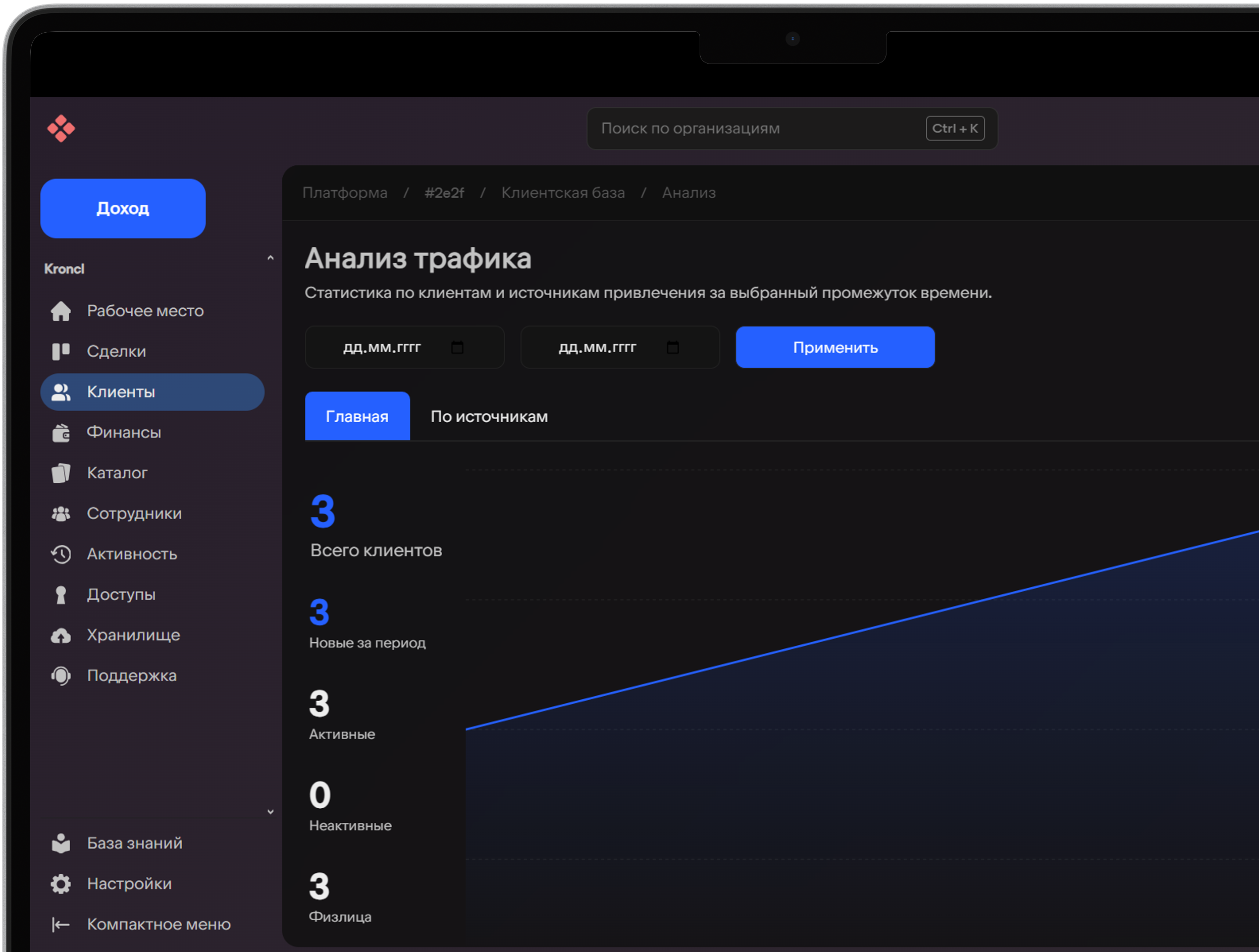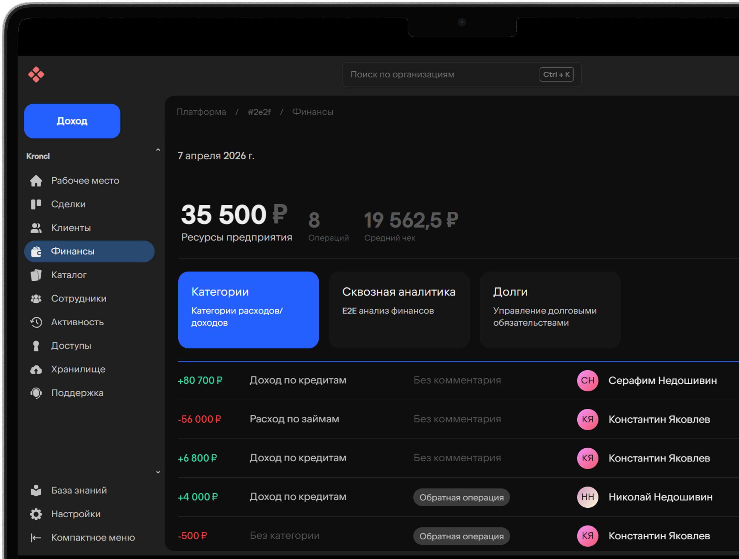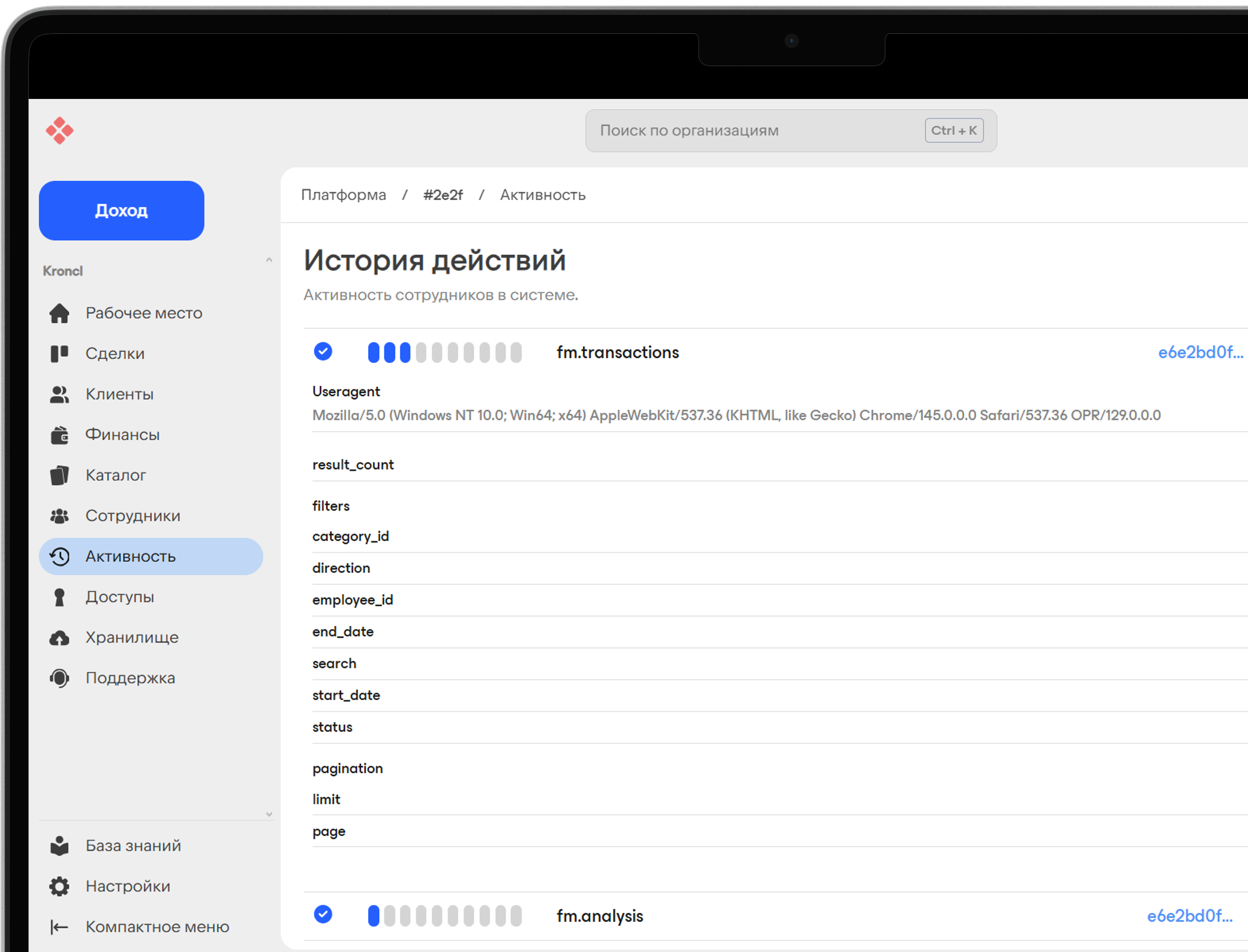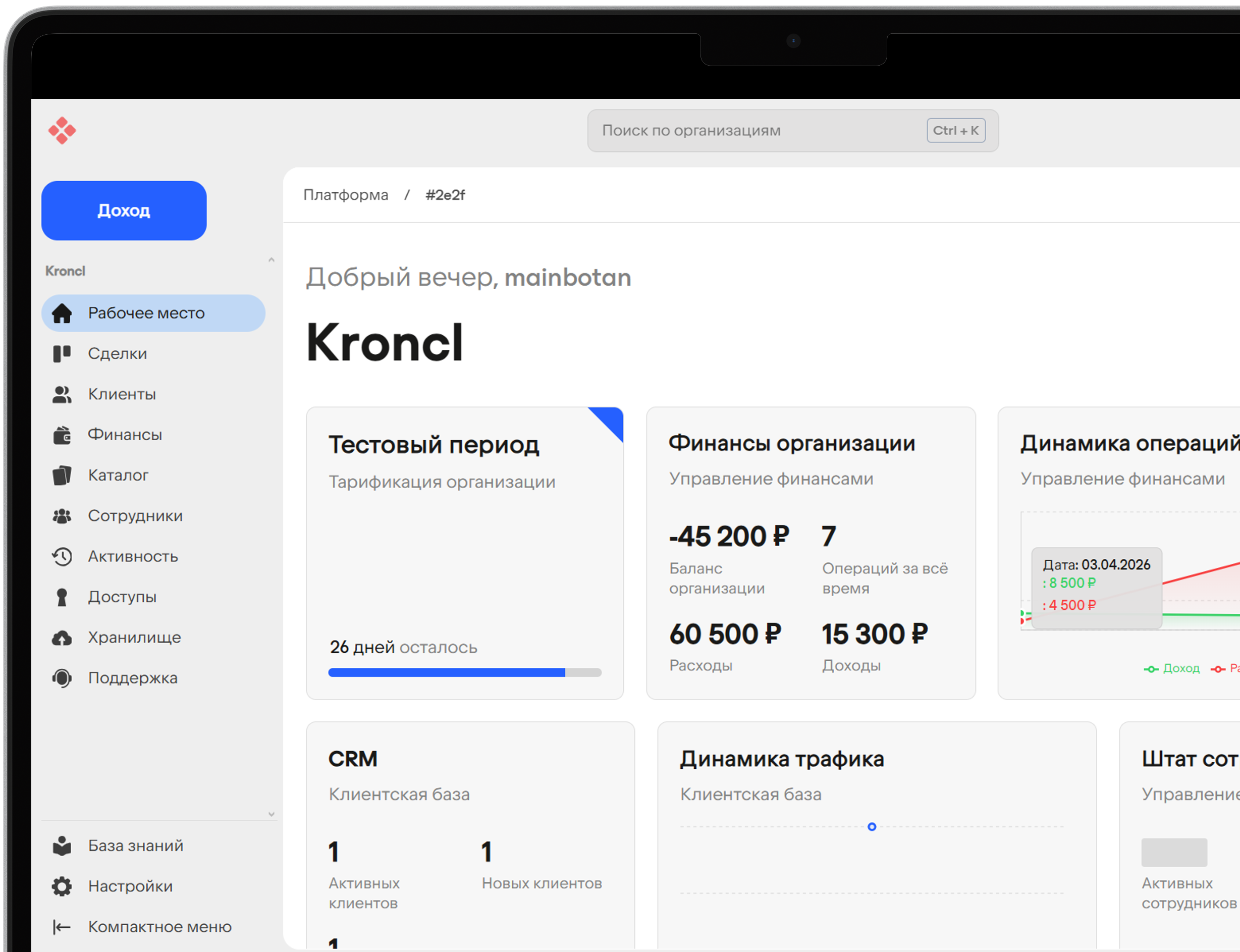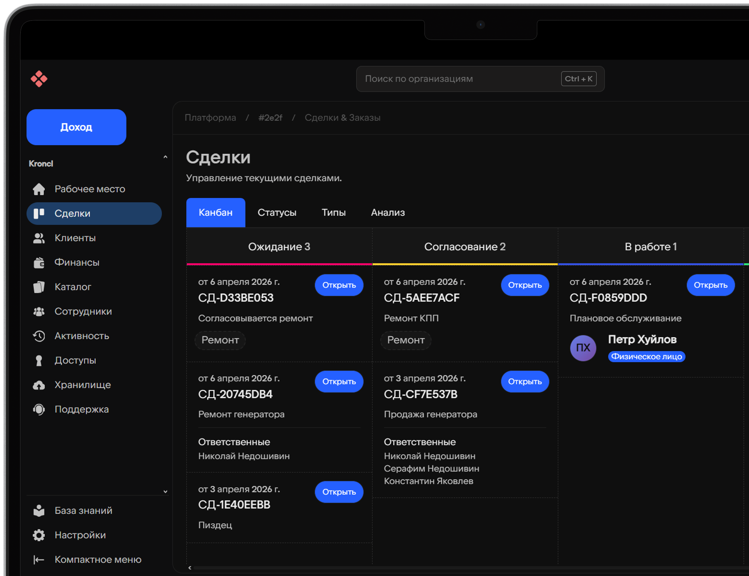 Перенесите клиентскую базу в защищённое хранилище Kroncl. Ведите индивидуальную историю клиентов, используйте инструменты повторого привлечения для повышения показателей удержания клиента.