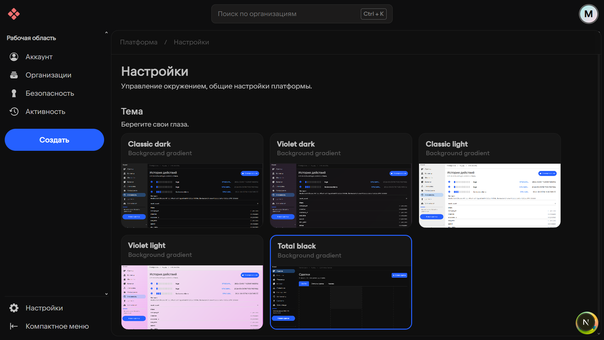 Используйте сочетание клавиш Ctrl+K (английская раскладка) для быстрого перемещения между пространствами учётных систем и доступа к наиболее используемым действиям.