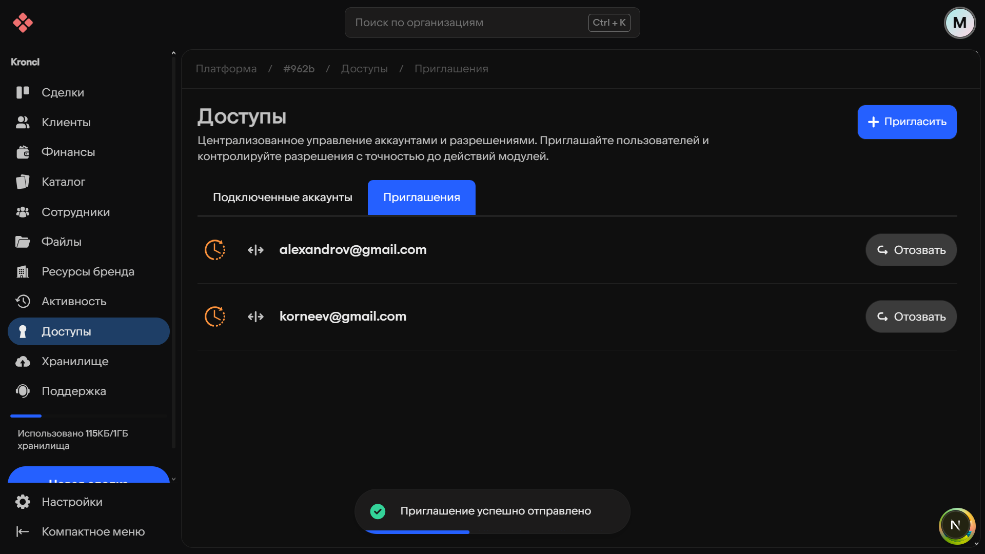 Обратите внимание: приглашение можно отправить и до регистрации пользователя на платформе. В таком случае мы вышлем письмо о приглашении в организацию с предложением зарегистрировать аккаунт Kroncl.