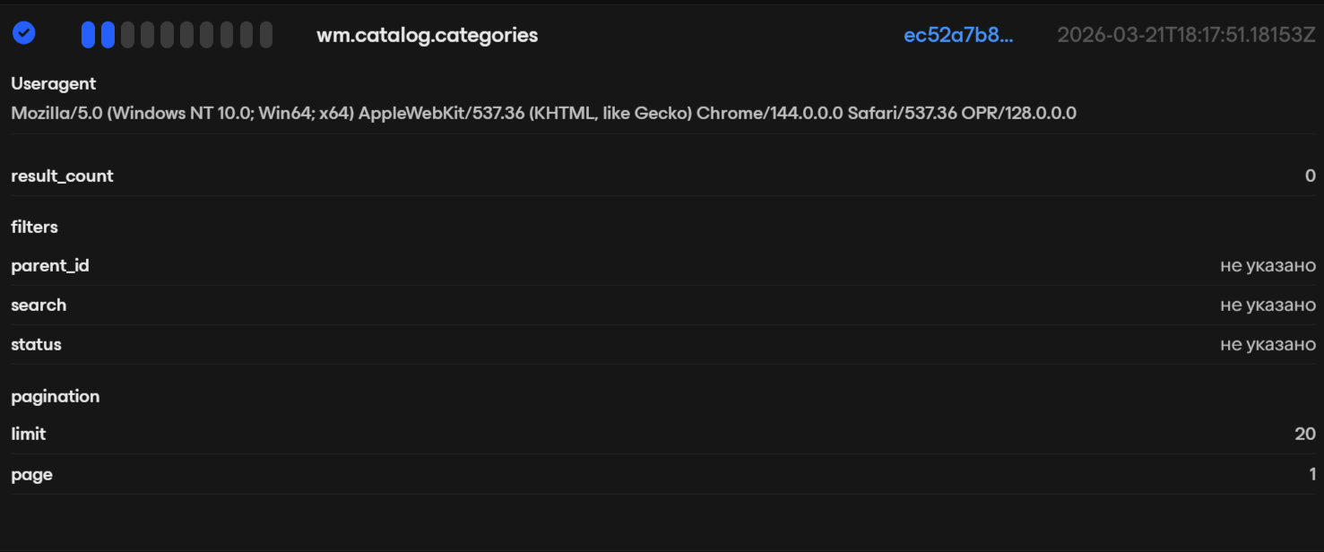 Идентификатор в левом верхнем углу лога — статус операции. Обращаем внимание, что логируются даже неуспешные действия. В случае ошибки в процессе выполнения операции вы увидите соответствующий идентификатор красного цвета.
