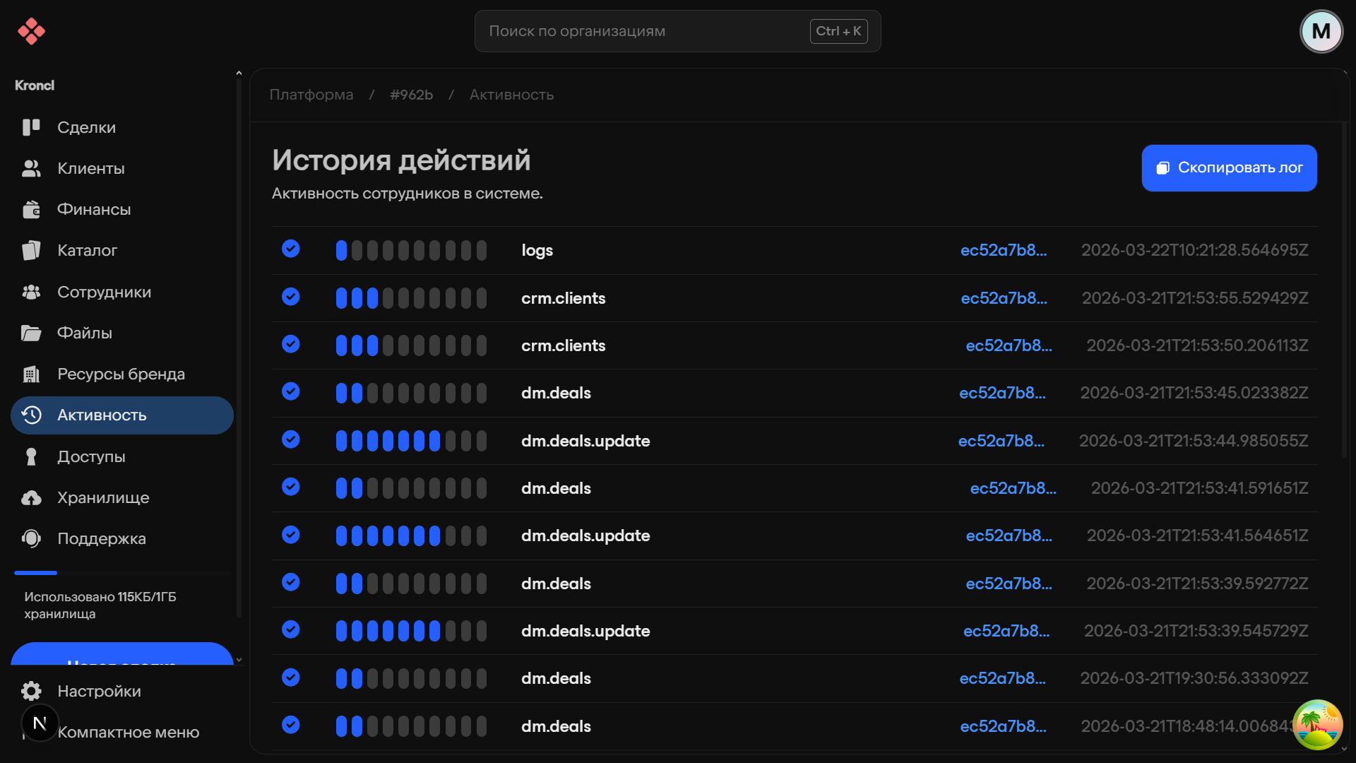Каждое действие, от просмотра финансовых операций до создания нового сотрудника, подлежит записи в лог действий организации с привязкой к аккаунту инициатора.