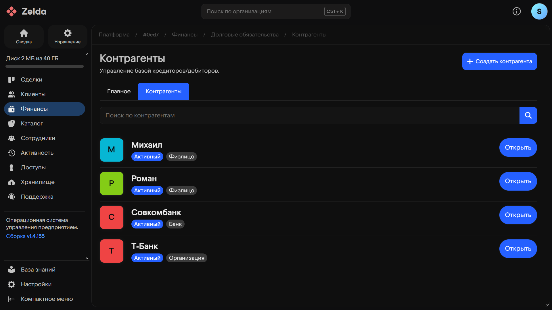 Для просмотра базы зарегистрированных контрагентов перейдите на страницу «Финансы» (левая боковая панель пространства организации), затем выберите раздел «Долги», после чего перейдите на вкладку «Контрагенты».