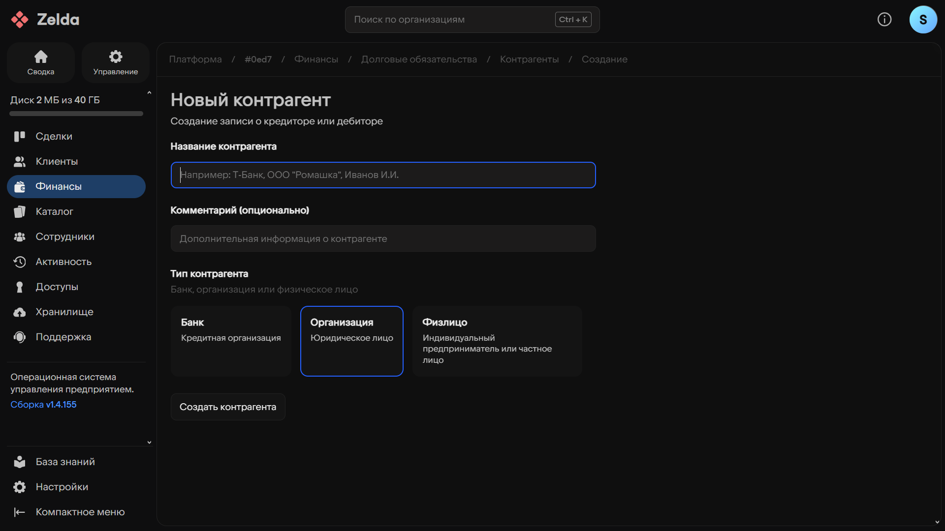 После создания контрагента вы будете переадресованы на его страницу.