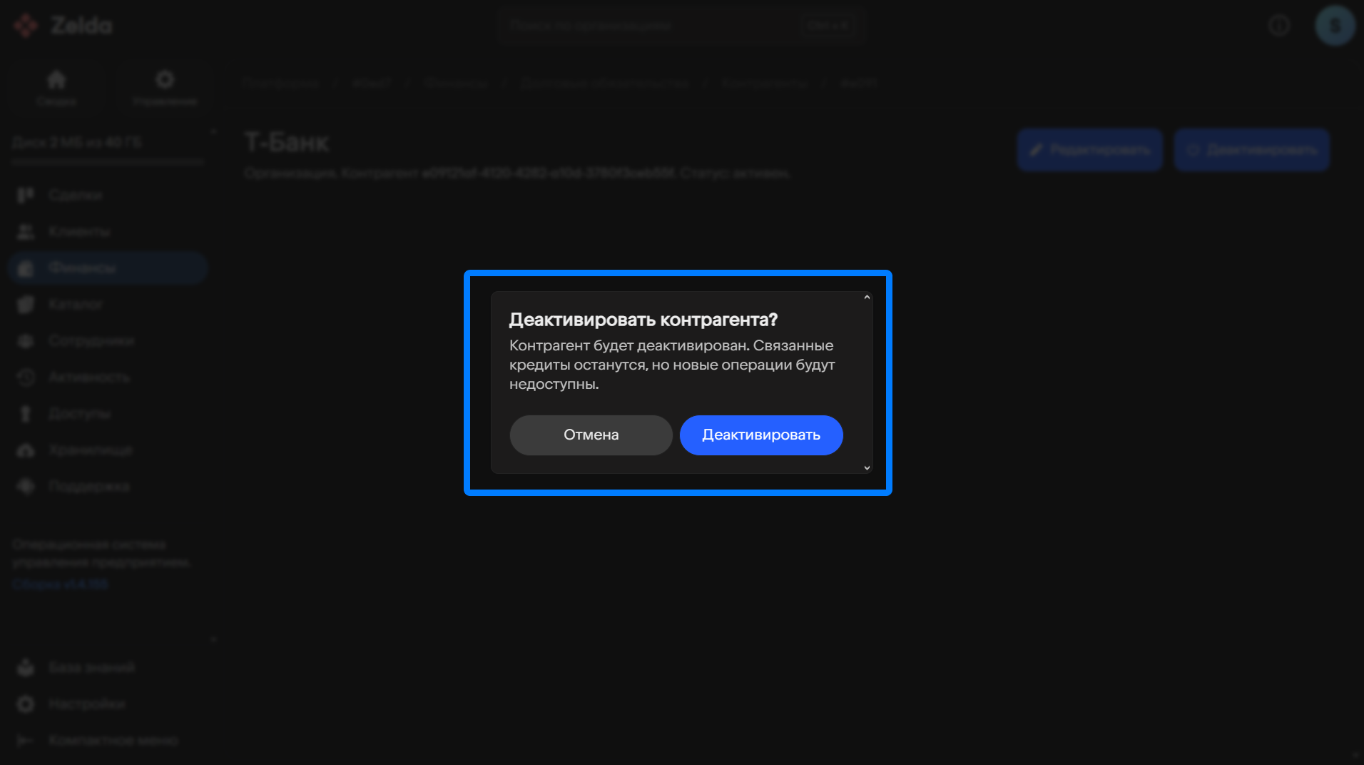 Деактивация контрагента физически не удаляет уже сохраненные данные, а лишь скрывает его для создания новых долговых обязательств.