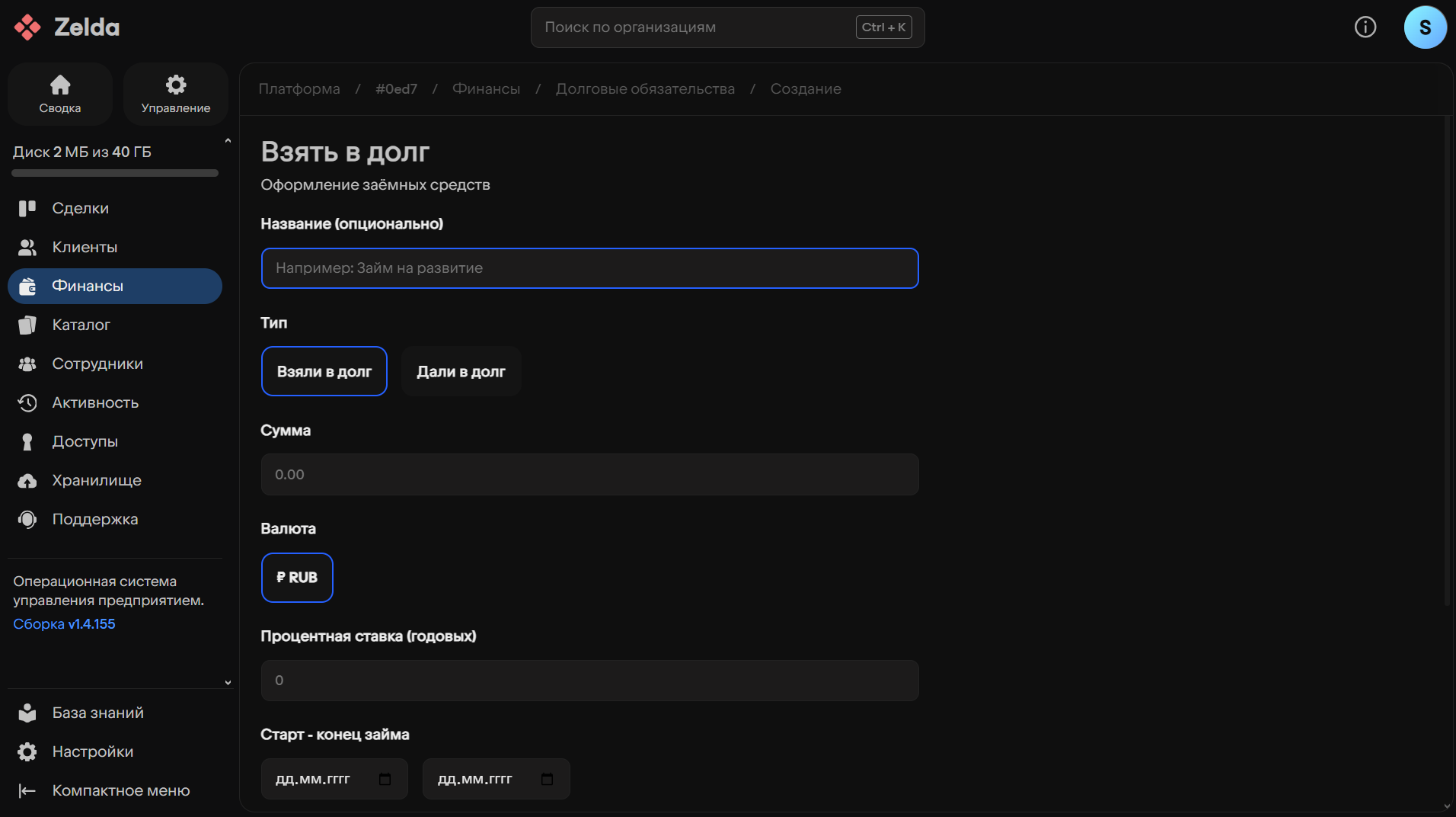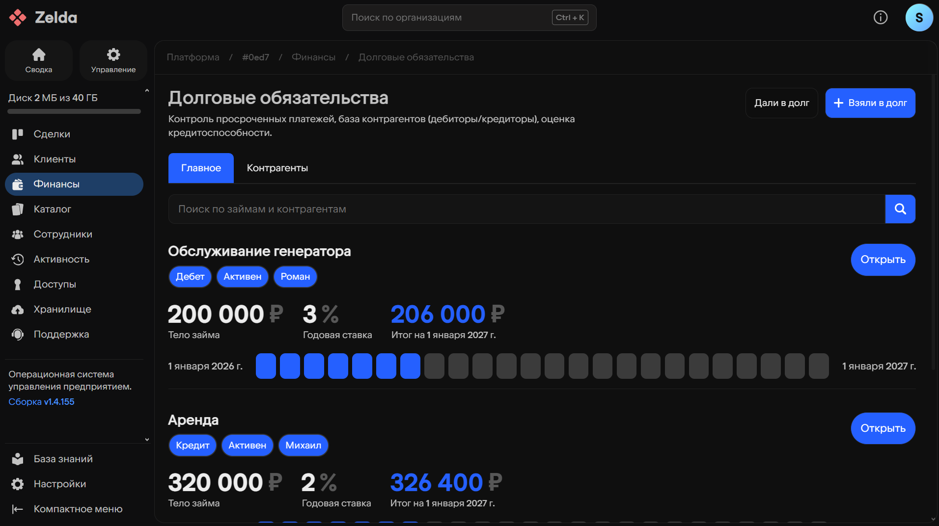 Для просмотра базы текущих долговых обязательств перейдите на страницу «Финансы» (левая боковая панель пространства организации), затем выберите раздел «Долги», после чего перейдите на вкладку «Главное».