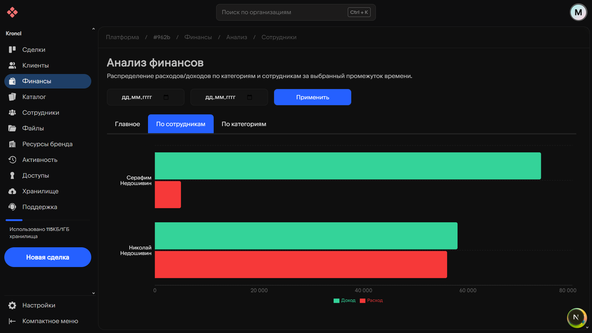 В подразделе «По сотрудникам» доступна столбчатая диаграмма распределения трат и доходов по сотрудникам (подробнее в главе «Сотрудники» модуля «Управление персоналом»).