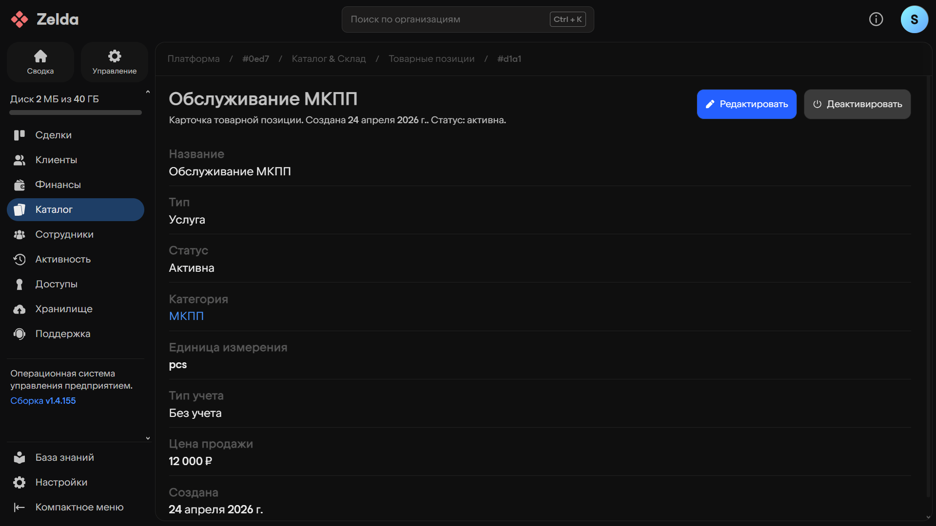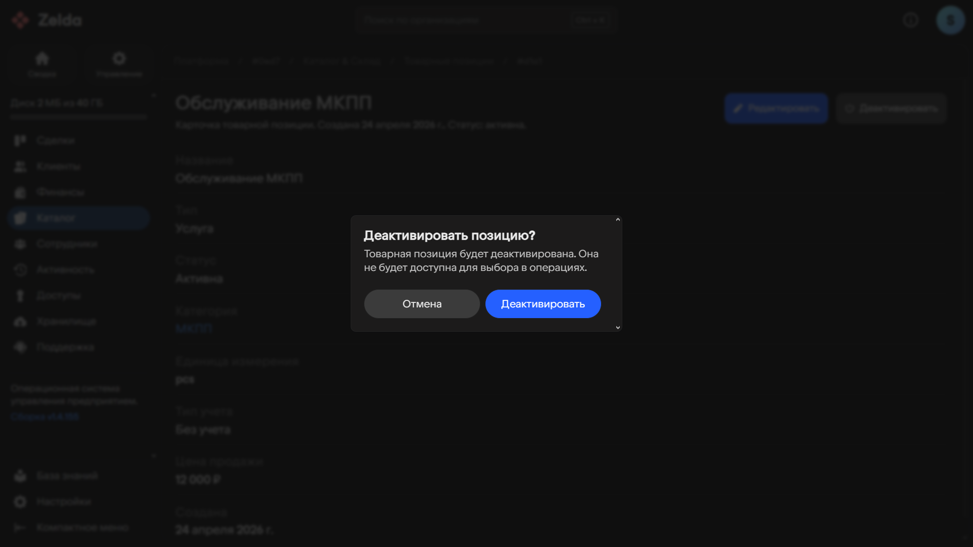 На странице товарной позиции доступны действия редактирования и деактивации.