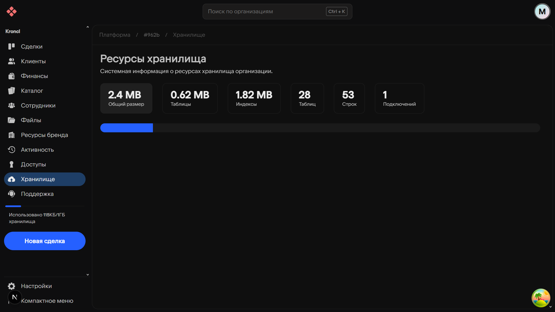 Мы также открыты для внепланового расширения лимитов конкретных организаций, выходящих за пределы классических тарифных планов. В том числе, команда Kroncl может помочь организации в миграции на отдельный инстанс хранилища данных исходя из заданных бюджетов.